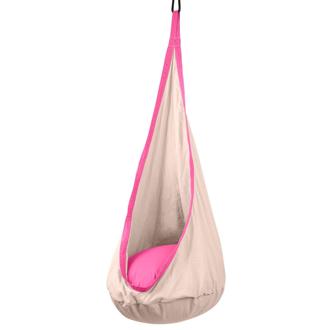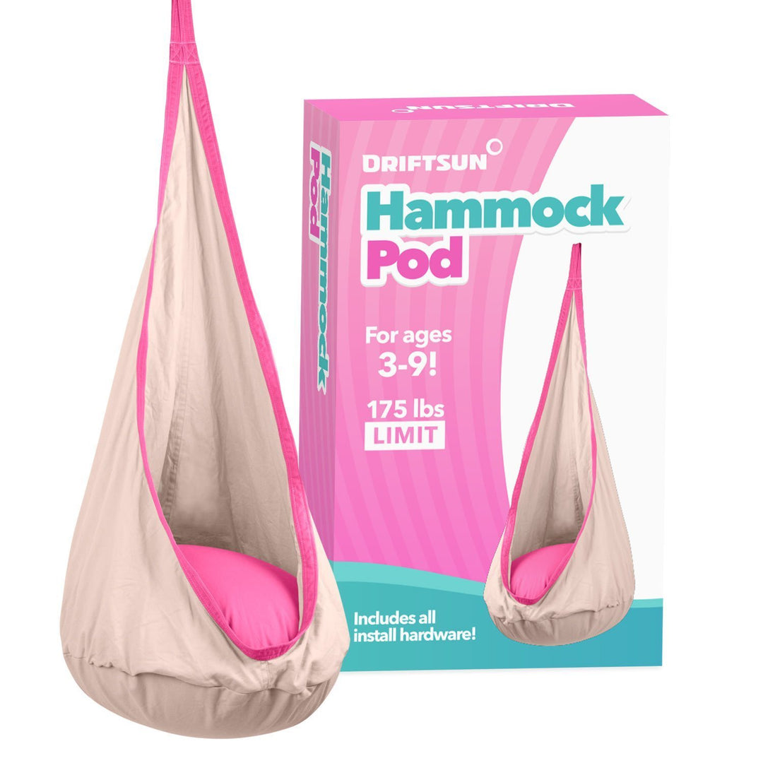Our Hammock pod swing can allow kids a new comfortable place to read, relax, or simply hangout. Our Hammock pod will look great in any room in any home. They come in a variety of color combinations such as: Blue and Green and Pink and White.