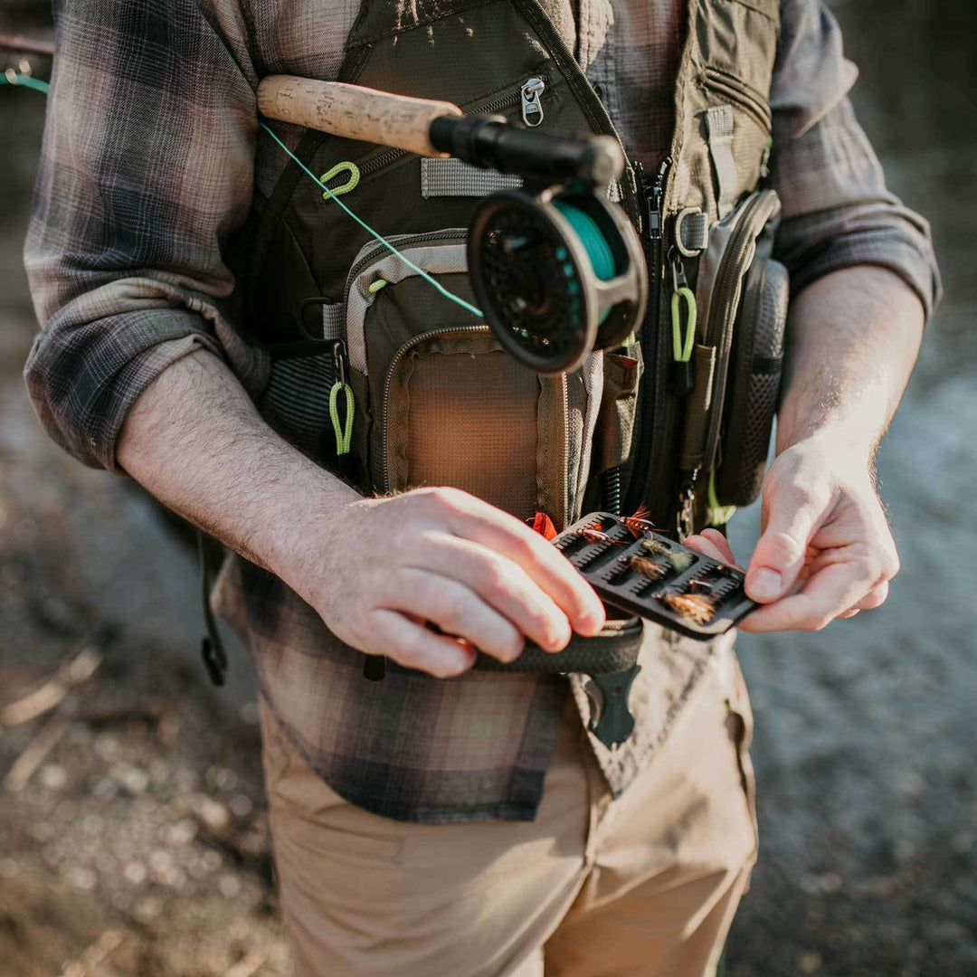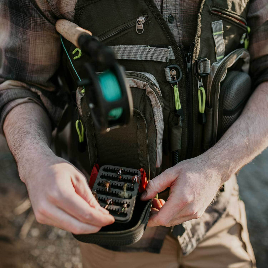 Two hard shell fly storage pockets allow you to quickly access your flies and keep them safe from harm when fishing! Two large storage pockets, four flush pockets, and an expandable three compartment backpack will provide plenty of space to keep all of your gear organized!