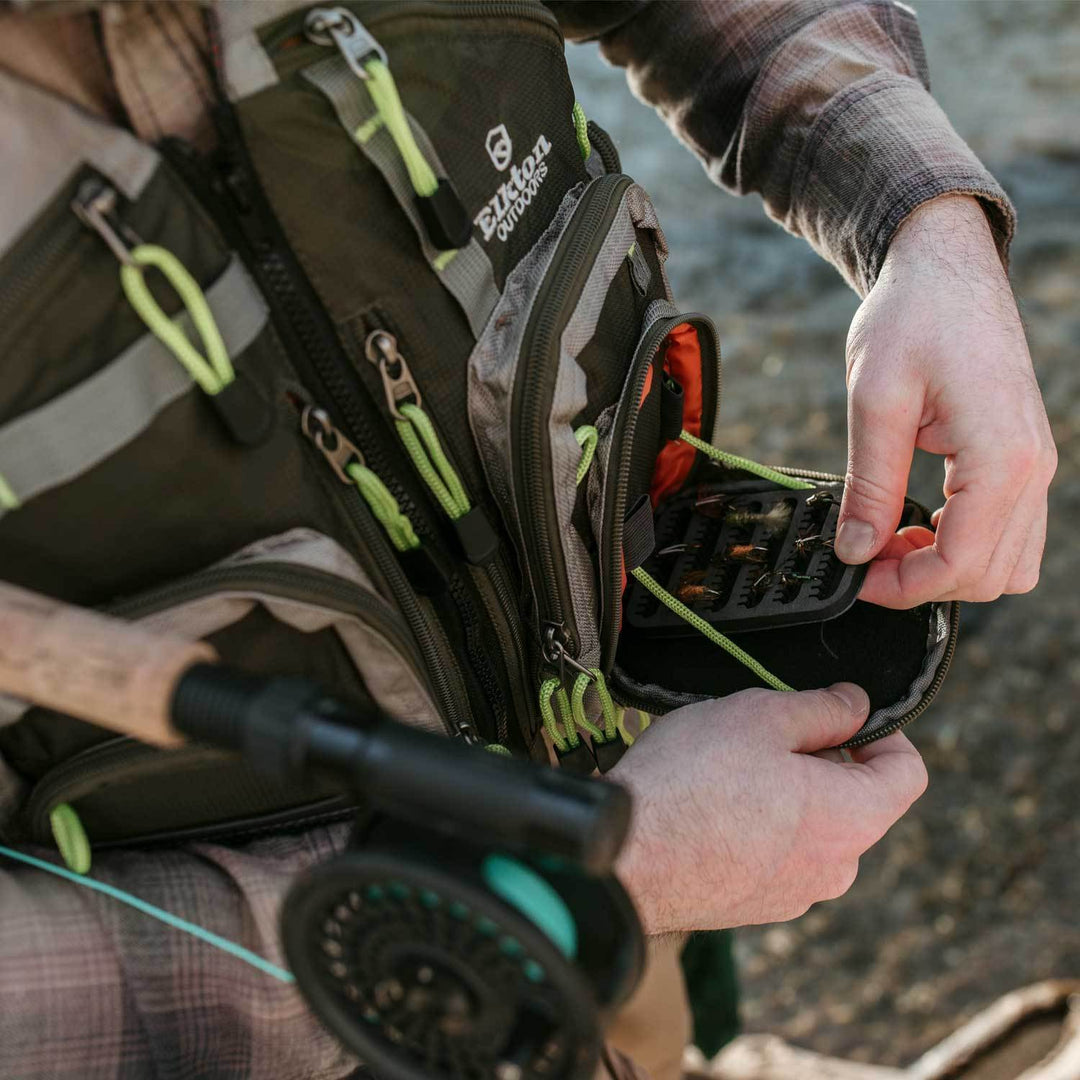 PLENTY OF STORAGE: This fly fishing backpack is equipped with all the storage you will need for your fishing trips including: 2 hard shell fly compartments, 8 general storage pockets and a 3 section extendable rear backpack