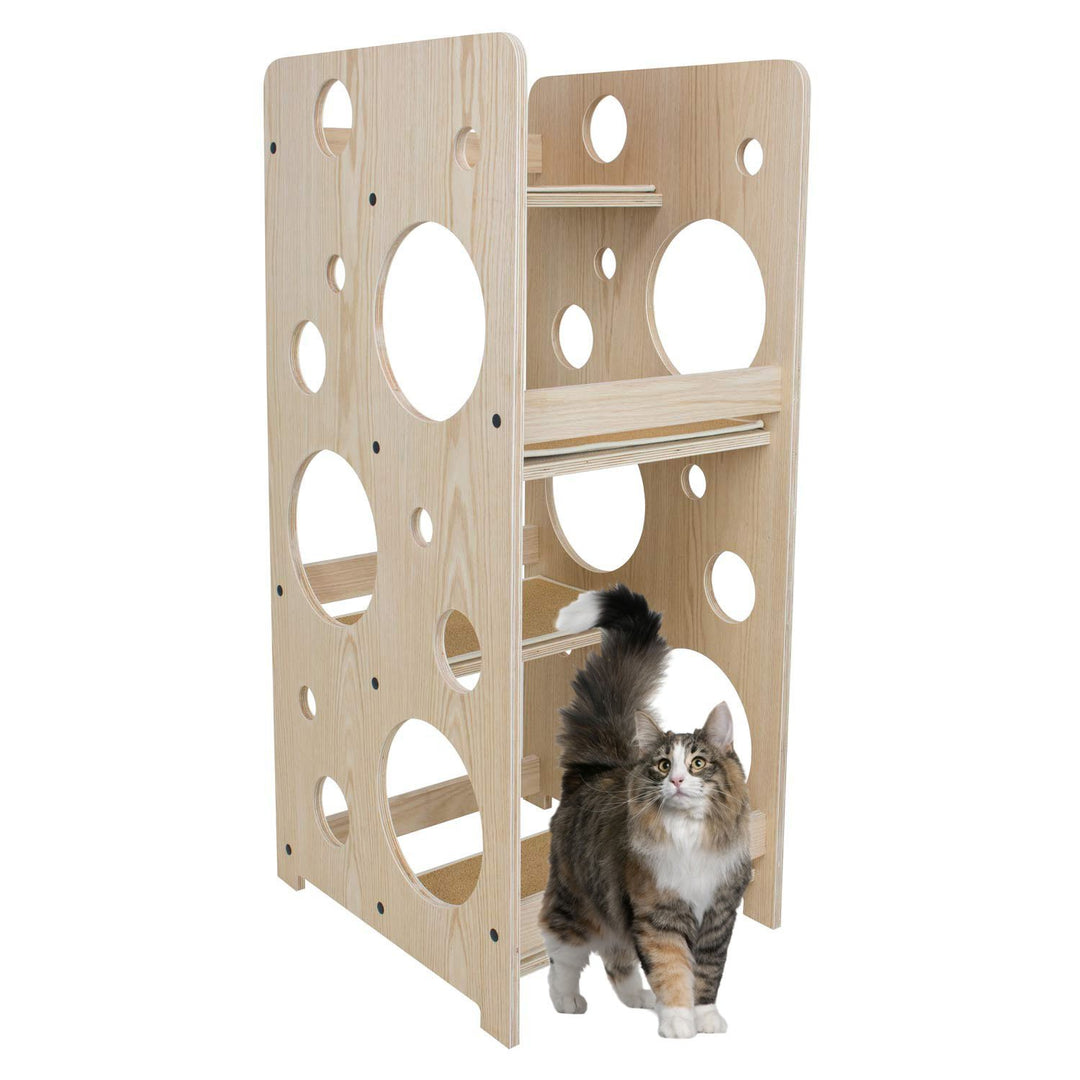 The Bubble Cat Tree Tower offers a modern touch to any home that your cat will love! With this wood cat tower your cat gets the opportunity to explore and exercise with the easy to navigate, multi level, carpeted cat steps. Each extra wide platform was designed so your cat can lounge and play without the discomfort of being confined to narrow spaces. The unfinished wood helps you to tap into your creative side by allowing you to paint, stain and customize your modern cat tree in a way that fits your home decor and style or you can choose to leave the unstained wood cat tree as is for a natural modern look! We build our cat towers with only premium wood and top quality hardware so you know that when you purchase an Bubble Cat Tree you are getting only the highest quality product available!