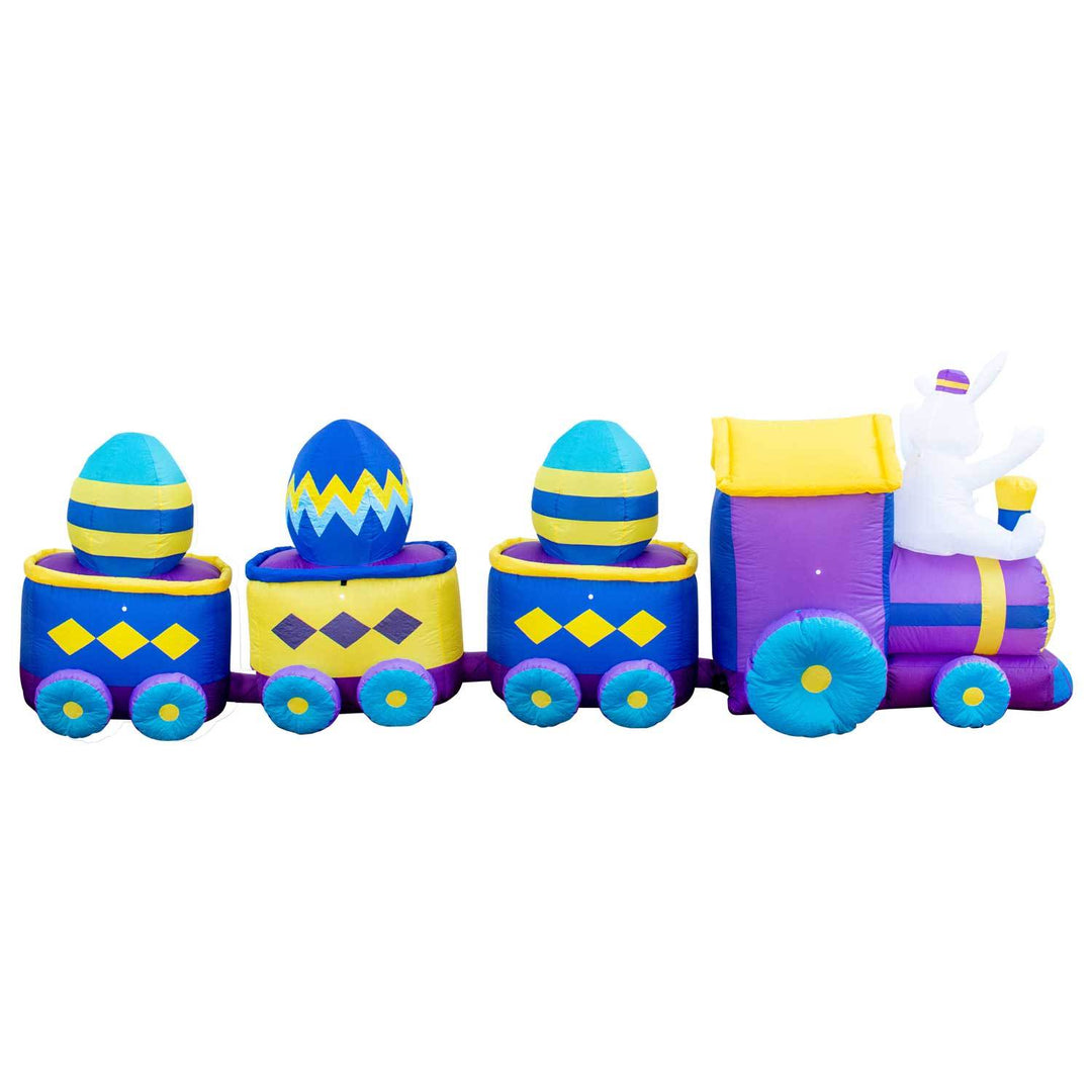 Get the Holidayana 14-Foot Inflatable long 3-Car Bunny Train Decoration that includes Built-in Bulb, Tie-Down Points, and Powerful Built in Fan.