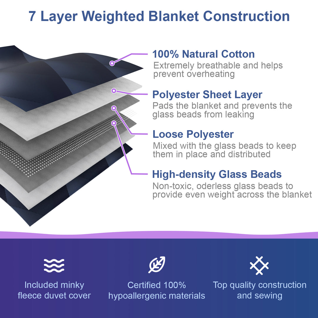 Each piece consists of two layers: an inner weighted blanket and an outer Minky Smooth Duvet Cover. Minky fabric is soft and soothing to the touch to help children wind down and fall asleep faster.