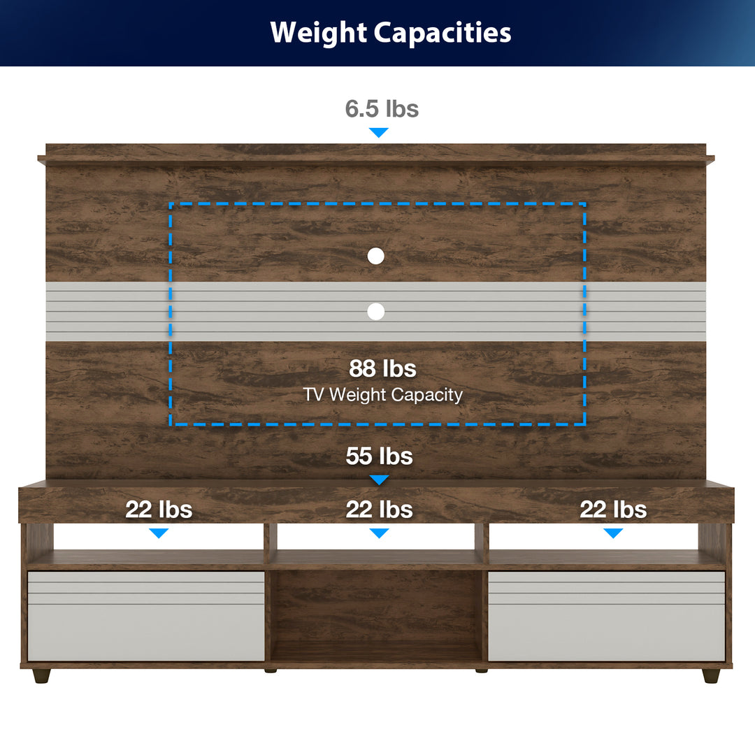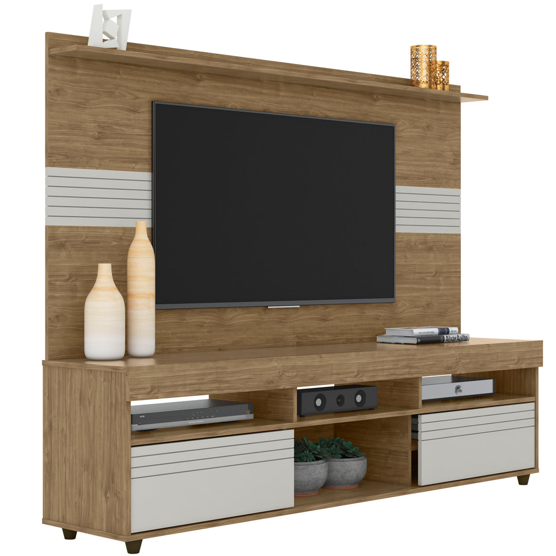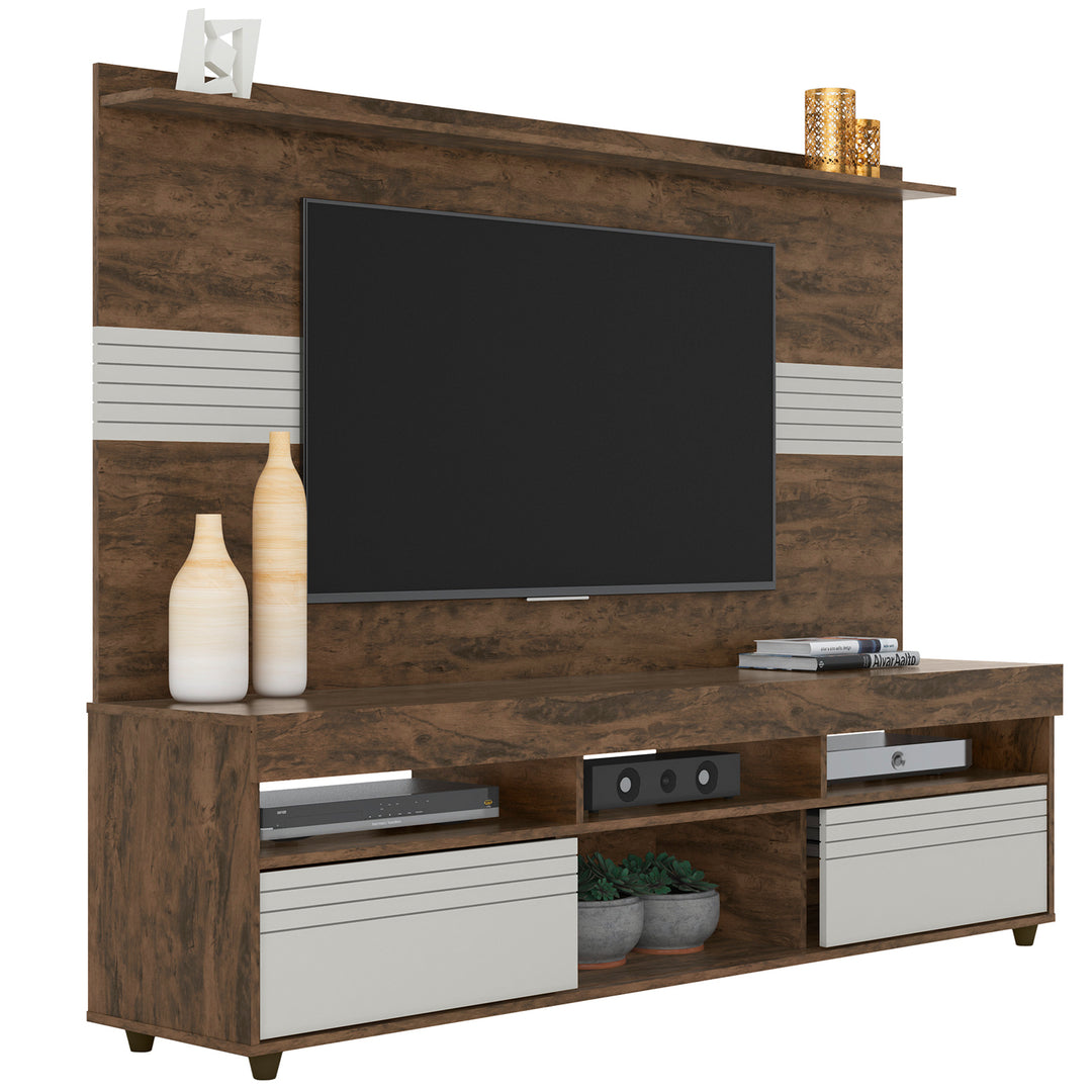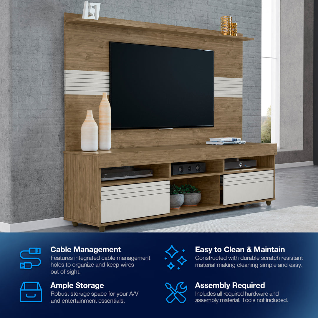 Fine craftsmanship, solid wood material in a luxurious grain finish, the Samba TV Stand and Panel Entertainment Center is designed to give your living room an impressive and modern look. Measuring 72″ in Width, 52″ in Height and 15″ in Depth, the stand features a central TV panel to securely mount any flatscreen TV up to 60” in size (can also accommodate smaller Televisions). It has pre-drilled holes where you can neatly slip cables behind to keep them clean and out of sight.