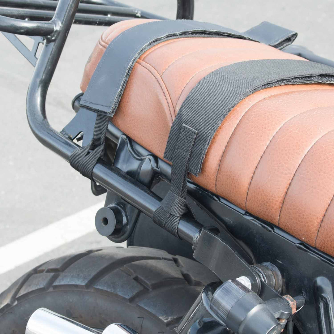 - Each bag comes with two mounting straps that attach to the bike directly or rack and clip into the bag. Additional Scrambler Straps are included with each bag for mounting just one bag at a time (see photo below). Great for when two bags aren’t needed or allowed (such as on bikes with a high exhaust on one side. You can also share a bag with a friend.