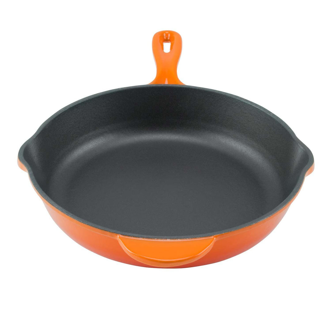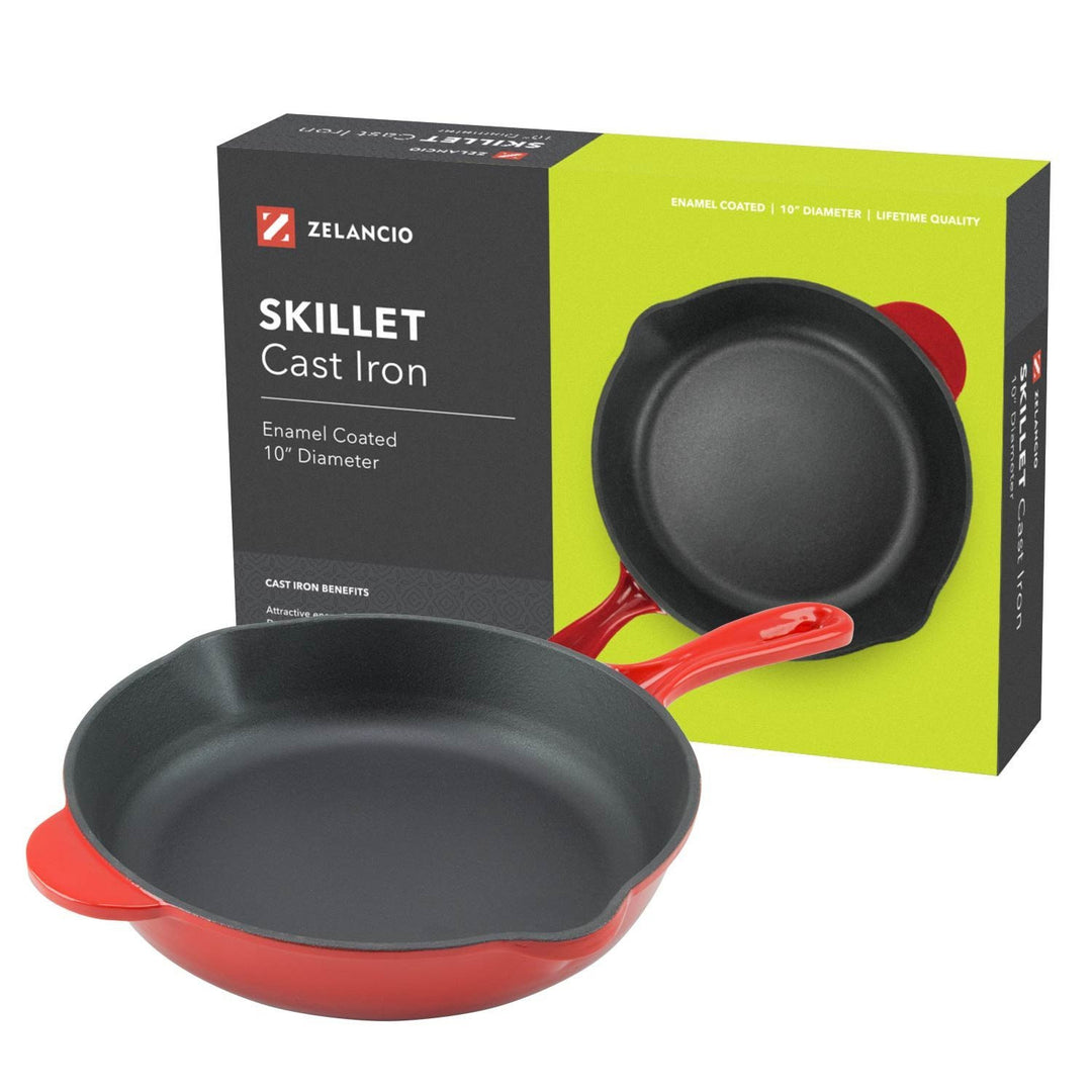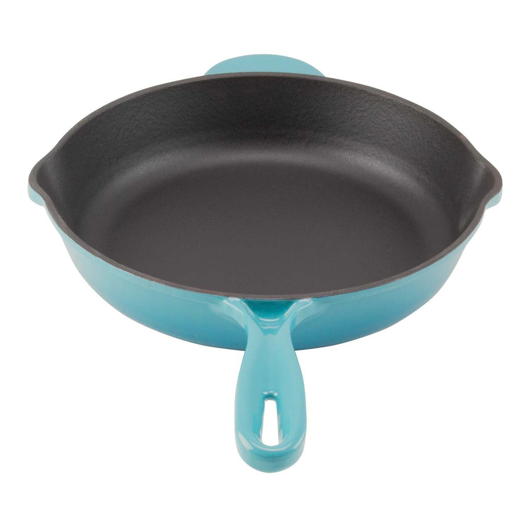 One frying pan will take you through breakfast, lunch, and dinner – and look fantastic doing it. The Zelancio 10-inch skillet has a smooth, black interior surface so you can perfectly sear meats, saute vegetables, and cook eggs any style. For the best results, preheat the pan for a few minutes before you start cooking. Cast iron construction provides superior heat distribution and three layers of porcelain enamel make the finish durable and chip-resistant. Spouts on both sides make it easy for left-handed and right-handed cooks alike to drain away fat, or pour sauces and gravies. Able to withstand temperatures up to 500-degrees Fahrenheit, this versatile pan goes from stovetop to oven to broiler. Available in three, rich contemporary colors, this skillet will look great on the pot rack or on the table. Choose from vibrant red, orange, or teal. To keep your cast iron enamel cookware in great condition, handwashing is recommended.