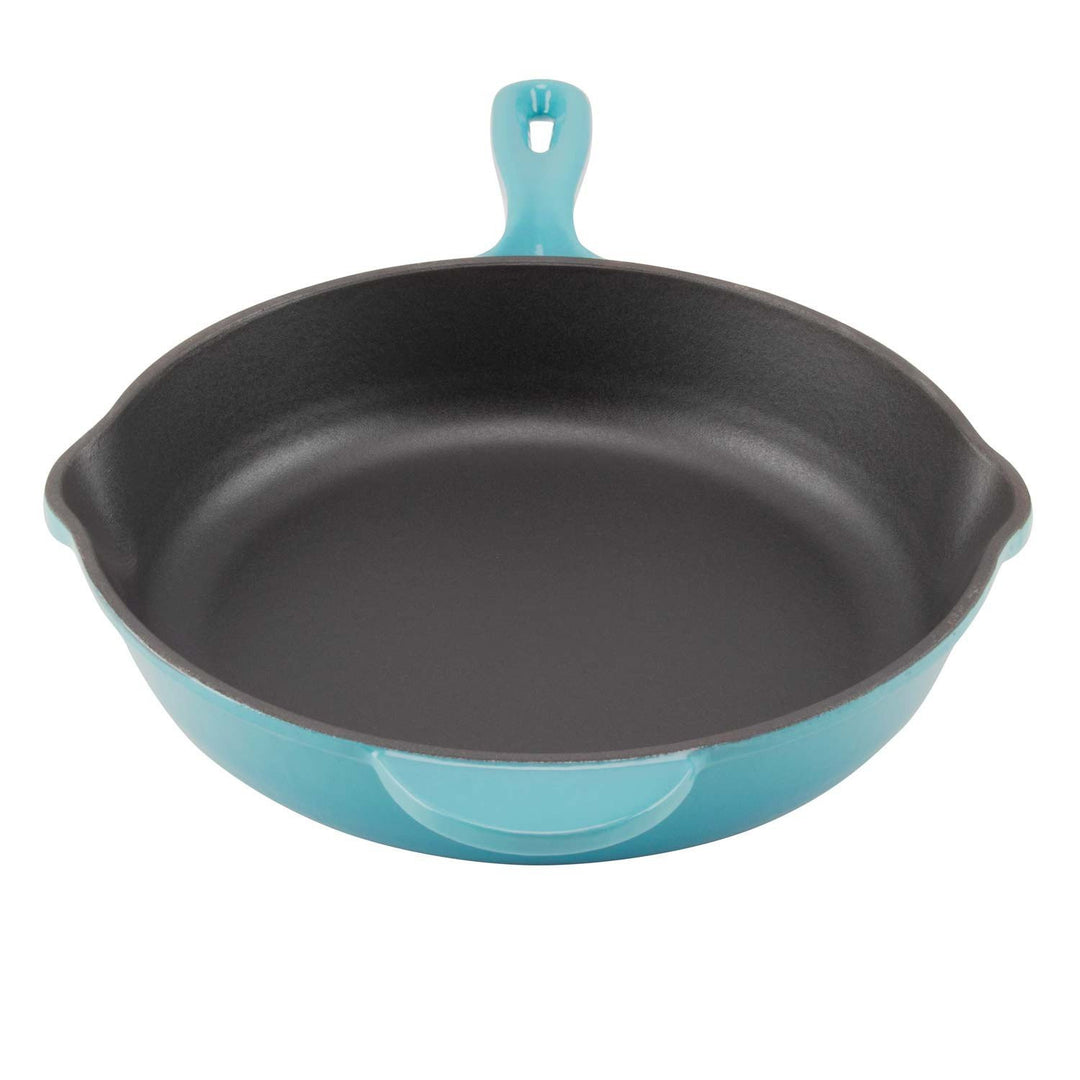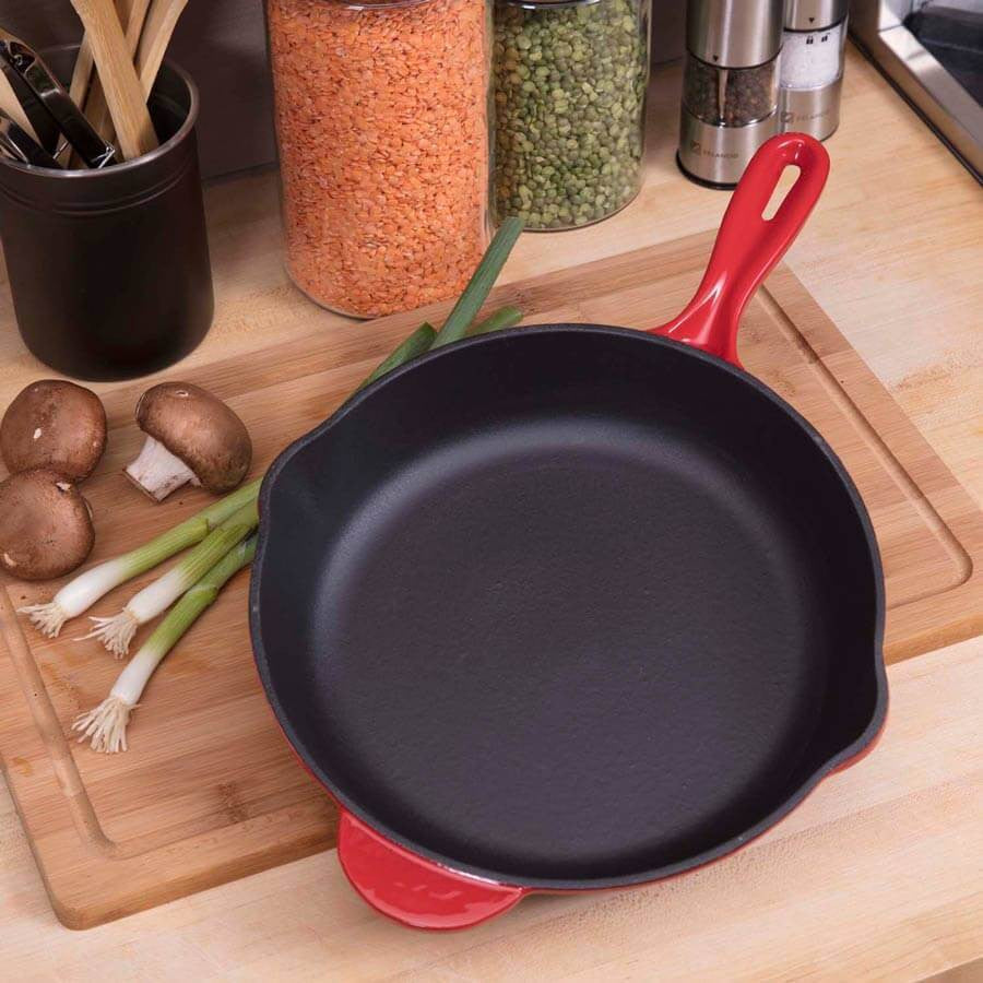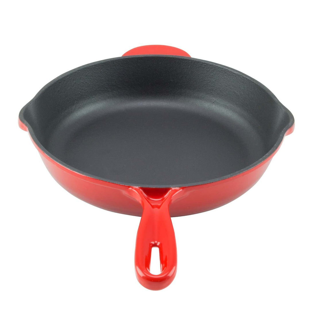 One frying pan will take you through breakfast, lunch, and dinner – and look fantastic doing it. The Zelancio 10-inch skillet has a smooth, black interior surface so you can perfectly sear meats, saute vegetables, and cook eggs any style. For the best results, preheat the pan for a few minutes before you start cooking. Cast iron construction provides superior heat distribution and three layers of porcelain enamel make the finish durable and chip-resistant. Spouts on both sides make it easy for left-handed and right-handed cooks alike to drain away fat, or pour sauces and gravies. Able to withstand temperatures up to 500-degrees Fahrenheit, this versatile pan goes from stovetop to oven to broiler. Available in three, rich contemporary colors, this skillet will look great on the pot rack or on the table. Choose from vibrant red, orange, or teal. To keep your cast iron enamel cookware in great condition, handwashing is recommended.