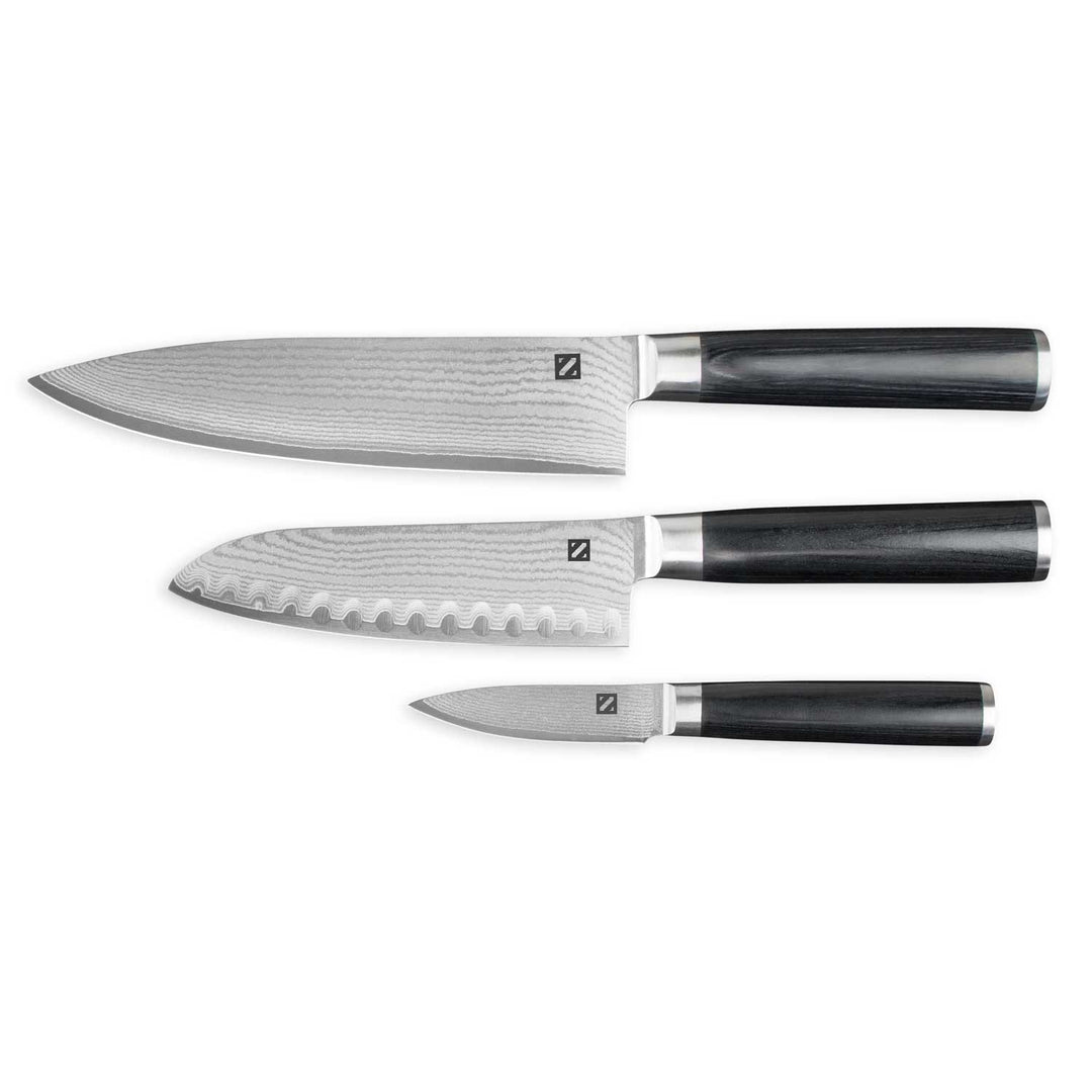 Outfit your kitchen with this essential three-piece set and be ready to prepare any dish. The set includes an 8-inch chef’s knife, the 6-inch Santoku knife, and a paring knife. The durable blade features a premium Japanese VG-10 Damascus steel with high carbon core surrounded by 67 layers of folded Damascus steel. Constructed for strength and beauty, the knives feature a naturally non-stick surface making it easy to chop herbs and mince garlic or onions. Constructed of Pakkawood, the universal-grip handles have a comfortable, ergonomic design so you can take on complicated cooking tasks without hand or wrist fatigue. The contrast of the rich, dark Pakkawood and the sleek steel blades make this chef-quality cutlery attractive enough to display.