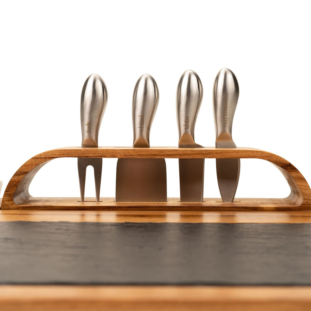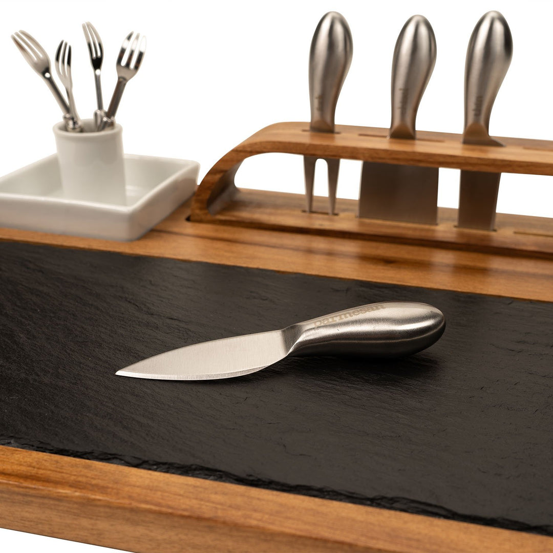 - Hand cut slate stones are smoothed and finished to perfection, premium solid stainless steel cheese tools